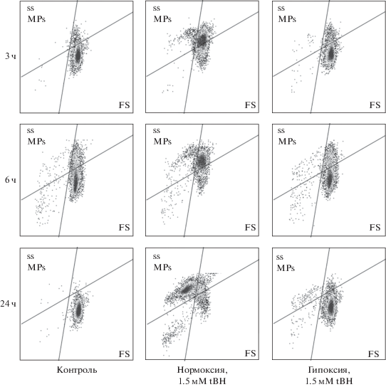 Гипоксические условия ингибируют образование микрочастиц эритроцитов при окислительном стрессе. Суспензию эритроцитов (0.5 × 109 кл/мл) инкубировали с 1.5 мМ tBH в течение 3, 6 и 24 ч. Показаны точечные диаграммы (dot-plots) для проб через 3, 6, 24 ч (данные репрезентативного эксперимента на проточном цитометре). *MPs – микрочастицы.