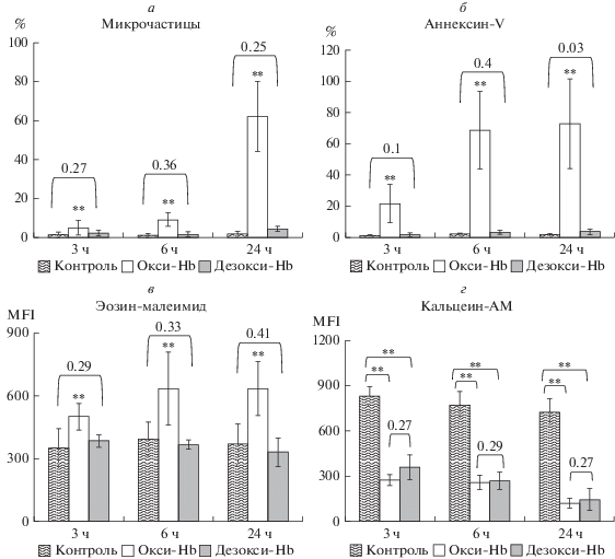 Далее мы проверили, как влияют гипоксические условия (дезокси-Hb) на эти маркеры. Уже через 3 ч после добавления tBH (1.5 мМ) в суспензию эритроцитов (RBC 0.5 × 109 кл/мл) выявлено: а) уменьшение образования микрочастиц при гипоксии (процент образования микрочастиц): окси-Hb 7.55 ± 1.37, дезокси-Hb 2.81 ± 1.22, p < 0.04, n = 15 (рис. 8а); б) значительное уменьшение экстернализации фосфатидилсерина при гипоксии (% аннексин-V-позитивных клеток): окси-Hb 66.8 ± 18.2, дезокси-Hb 2.8 ± 1.2, p < 0.0001, n = 13 (рис. 2б); в) кластеризация AE1 при нормоксии и ее снижение при гипоксии (флуоресценция ЕМА): окси-Hb 609.2 ± 87.4, дезокси-Hb 320.1 ± 15.4, p < < 0.01, n = 12 (рис. 8в). В то же время ингибирование эстеразной активности при действии пероксида (кальцеин-AM) не зависело от состояния Hb: контроль 2687 ± 197, окси-Hb 1190 ± 247, дезокси-Hb 1102 ± 281 (рис. 2г).