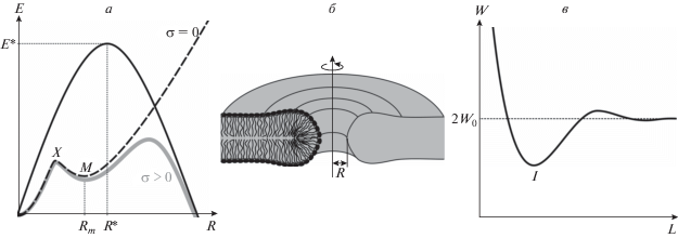 а – Зависимости энергии поры от ее радиуса в различных моделях. Сплошная черная кривая – приближение бесконечно тонкой бесструктурной пленки с приложенным латеральным натяжением σ, зависимость описывается уравнением (1). При критическом радиусе поры R * энергия максимальна (E *). Поры, радиус которых меньше критического, спонтанно закрываются. Если радиус поры больше критического, пора неограниченно растет. Черная штриховая кривая – энергия деформаций мембраны на кромке поры, рассчитываемая в рамках теории упругости сплошной среды, при нулевом латеральном натяжении. Зависимость имеет локальный минимум (M) при радиусе поры Rm; для закрытия поры (R → 0) необходимо преодолеть энергетический барьер (X). Серая толстая кривая – энергия деформаций мембраны на кромке поры, рассчитываемая в рамках теории упругости сплошной среды, при ненулевом латеральном натяжении. б – Схематическое изображение сечения мембраны с круглой порой радиуса R плоскостью, проходящей через ось цилиндрической симметрии. Мембрана показана серым цветом. Липид на кромке поры испытывает деформацию поперечного изгиба; в среднем, молекулы формируют веерообразную структуру. в – Типичная зависимость энергии деформаций мембраны, индуцированных двумя мембранными включениями, от расстояния между включениями L. При больших L включения не взаимодействуют, и энергия равна сумме энергий деформаций, индуцированных изолированными включениями (2W0). Зависимость имеет глобальный минимум (I).