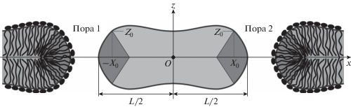 Чтобы задать участки, на которые разбивается кромка поры, рассмотрим горизонтальную мембрану с двумя сквозными порами (рис. 2). Будем считать, что система обладает зеркальной симметрией относительно плоскости межмонослойной поверхности. Для расчета одномерного потенциала взаимодействия пор также будем считать, что в системе имеется трансляционная симметрия вдоль кромки поры. Расстояние между точками пересечения межмонослойной плоскости и нейтральных поверхностей обозначим через L (рис. 2). Введем декартову систему координат Oxyz, начало координат O которой расположено на межмонослойной поверхности посередине между двумя кромками пор; ось Oz направлена перпендикулярно плоскости невозмущенной мембраны; ось Oy параллельна направлению трансляционной симметрии (вдоль кромки поры; на рис. 2 эта ось направлена от читателя), ось Ox перпендикулярна осям Oy и Oz. Каждая кромка разбивается на два участка: 1) “горизонтальный бислойный” участок, в котором директора и нормали к нейтральной поверхности слабо отклоняются от направления оси Oz; 2) “вертикальный монослойный” участок, в котором директора и нормали слабо отклоняются от направления оси Ox. Участки двух кромок сопрягаются вдоль линий {±X0, ±Z0} (рис. 2).