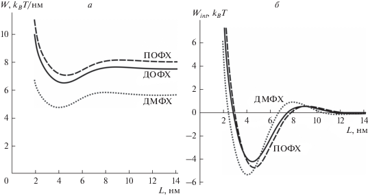 Зависимость энергии двух линейных параллельных кромок пор (в расчете на 1 нм длины вдоль кромки) от расстояния между кромками приведена на рис. 3а для мембран, сформированных из ДОФХ, ПОФХ, ДМФХ. Из рисунка видно, что глобальный минимум упругой энергии достигается при расстоянии между порами L = 4–5 нм. При сближении, L < 4 нм, поры отталкиваются. При увеличении расстояния между кромками 4 нм < L < 8 нм поры притягиваются друг к другу. При расстоянии между кромками L ≈ 12 нм имеется локальный минимум упругой энергии, однако его глубина крайне мала (<0.1 kBT). В целом, можно считать, что поры практически не взаимодействуют друг с другом при расстоянии между их кромками L > L0 ≈ 10 нм. Ранее в ряде работ проводилось численное моделирование пор в мембранах методом молекулярной динамики [31, 32, 46, 47]. В таких расчетах, как правило, используются периодические граничные условия. Из зависимостей энергии от расстояния между кромками пор, представленных на рис. 3а, следует, что для исключения взаимодействия моделируемых методом молекулярной динамики кромок пор с границей расчетной ячейки латеральный размер ячейки должен быть больше, чем (2R + L0) ≈ 16 нм при максимальном радиусе моделируемой поры R ≈ 3 нм.