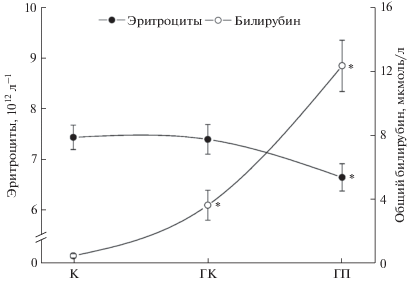 Изменение количества эритроцитов и общего билирубина в плазме крови крыс при гипотермии. К – контроль; ГК – кратковременная гипотермия 30°C; ГП – пролонгированная 3 ч гипотермия 30°С. * – достоверные (p < 0.05) различия относительно контроля.