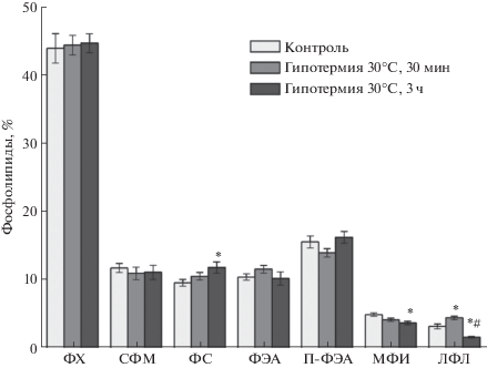 Изменение содержания фосфолипидов (в % от суммы) в мембранах эритроцитов крыс при гипотермии. * – достоверные (p < 0.05) различия относительно контроля, # – достоверные (p < 0.05) различия относительно кратковременной гипотермии.