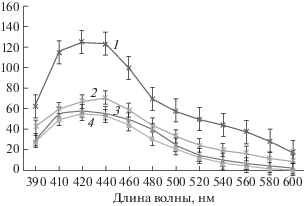 Спектры флуоресценции продуктов ПОЛ в мембранах митохондрий проростков гороха в условиях дефицита воды (ДВ) и при обработке семян ТНКЖтио. По оси ординат – интенсивность флуоресценции (усл. ед/мг белка), по оси абсцисс – длина волны в нм. 1 – ДВ; 2 – ДВ + 3 × 10–5 М ТНКЖтио; 3 – ДВ + + 3 × 10–6 М ТНКЖтио; 4 – контрольная группа проростков, которая находилась на влажной фильтровальной бумаге в течение 5 сут.