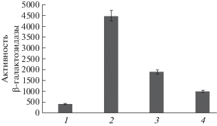 Влияние теплового шока и ТНКЖ на экспрессию гена sfiA в клетках E. coli PQ37. 1 – тепловой шок (ТШ); 2 – ТШ + НХО (4-нитрохинолина оксид); 3 – ТШ + ТНКЖтио; 4 – ТШ + ТНКЖтио + ПАБК (парааминобензойная кислота). По оси ординат – активность β-галактозидазы в единицах Миллера.