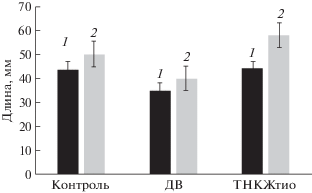 Влияние дефицита воды (ДВ) и обработки семян гороха ТНКЖтио на длину побегов и корней 5-дневных проростков. 1 – корни; 2 – побеги.