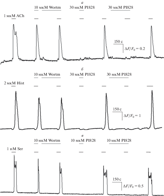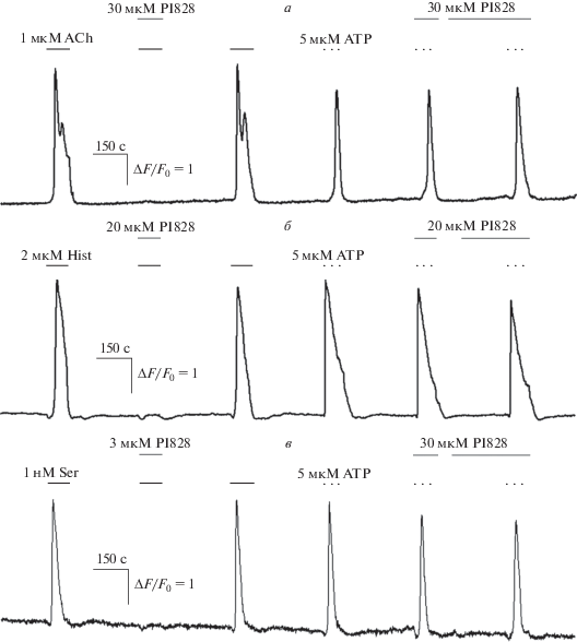 Для анализа влияния PI828 на Ca2+-сигналы, инициированные ацетилхолином и гистамином, использовали клетки, эндогенно экспрессирующие мускариновые или гистаминовые GPCR-рецепторы, а именно, клетки почки эмбриона человека HEK293 и клетки глиомы мозга крысы С6 соответственно. Кратковременная стимуляция соответствующих клеток ацетилхолином (1 мкМ) или гистамином (2 мкМ) инициировала в них Ca2+-ответы, которые полностью подавлялись в присутствии PI828 в концентрации 10–30 мкМ (рис. 1а, 1б). Для исследования влияния PI828 на серотонин-индуцированную Са2+-сигнализацию использовали моноклональную линию клеток яичника китайского хомячка CHO/5-HT2C, полученную нами ранее путем трансфекциии клеток CHO плазмидным вектором, несущим кДНК серотонинового рецептора 5-HT2C. Как и в случае Са2+-ответов на ацетилхолин и гистамин (рис. 1а, 1б), PI828 в концентрации 3 мкМ обратимо блокировал Ca2+-ответы клеток CHO/5-HT2C на серотонин (1 нМ) (рис. 1в).