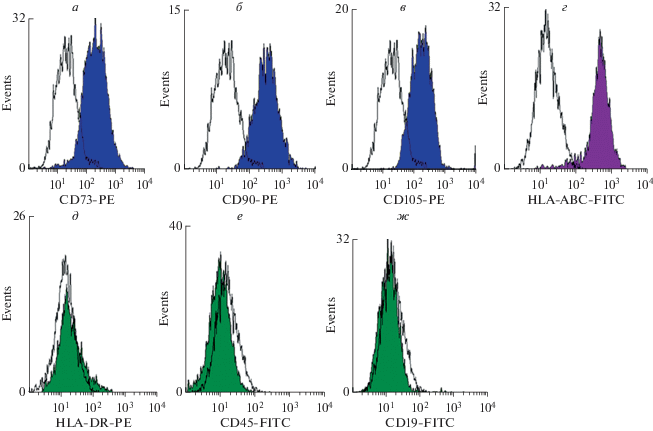 Анализ экспрессии поверхностных маркеров ММСК Вартонова студня. Экспрессия специфичных маркеров ММСК CD73 (а), CD90 (б), CD105 (в) и HLA-ABC (г); отсутствие экспрессии маркеров лимфоидных клеток HLA-DR (д), CD45 (е) и CD19 (ж) клетками ММСК Вартонова студня.
