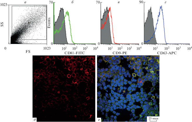 Характеристика экзосом ММСК-ВС. а–г: Анализ экспрессии специфичных маркеров экзосом CD81 (б), CD9 (в) и CD63 (г) проводили в окне мелких объектов (а). Аутофлуоресценция показана на серой гистограмме. Сдвиг по оси абсцисс соответствует экспрессии маркеров (цветные гистограммы). д–е: Связывание экзосом с мембранами клеток фибробластов L929. Клетки культивировали на покровных стеклах, инкубировали с экзосомами (д, красные), дополнительно окрашивали мембраны маркером аппарата Гольджи (е, зеленый). Ядра окрашены DAPI (синий). Колокализация экзосом с мембранами клеток (е, желтый). Шкала – 25 мкм.