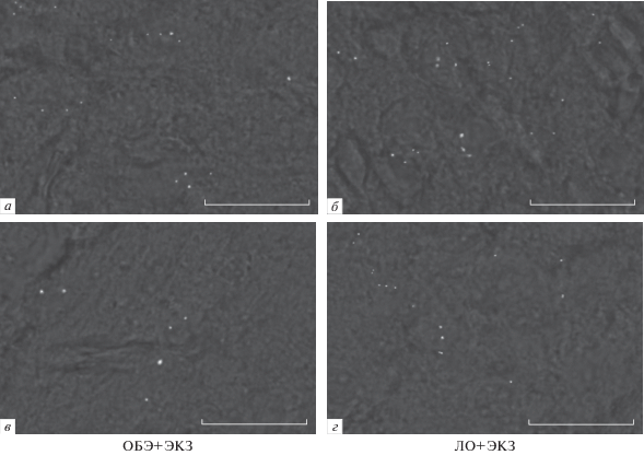 Примеры распределения экзосом, меченных флуоресцентным красителем Dil, в неокортексе (а, б) и гиппокампе (в, г) ОБЭ (а, в) и ЛО (б, г) мышей через 4 ч после внутривенного введения. Шкала – 25 мкм. На микрофотографиях представлены участки мозга в проходящем свете с наложением соответствующих флуоресцирующих частиц.