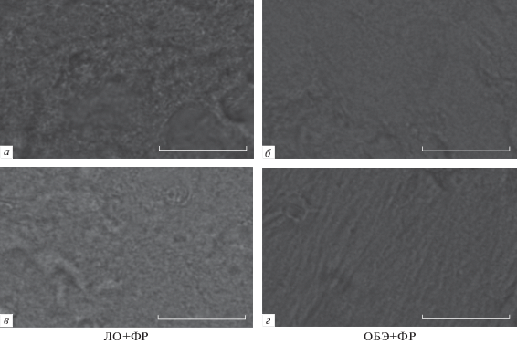 Репрезентативные микрофотографии срезов неокортекса (а, б) и гиппокампа (в, г) контрольных ЛО (а, в) и ОБЭ (б, г) мышей через 4 ч после внутривенного введения ФР. Шкала – 25 мкм.