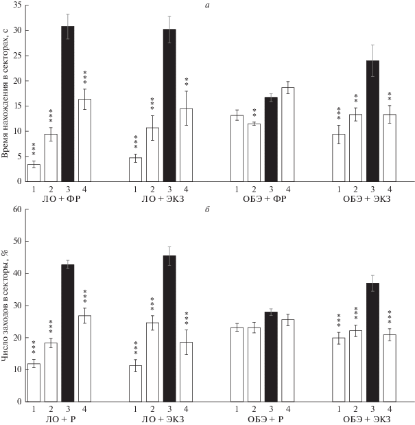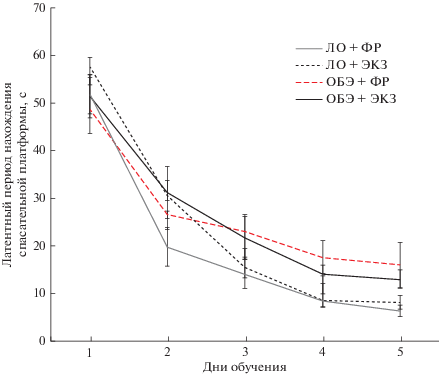 Время нахождения в третьем секторе лабиринта Морриса у групп животных: ЛО + ФР, ЛО + ЭКЗ, ОБЭ + ФР и ОБЭ + ЭКЗ составило (с): 30.8 ± 2.4, 30.2 ± 2.7, 16.7 ± 0.8 и 24 ± 3.1 соответственно. Соотношение количества заходов в третий сектор обучения к общему числу заходов во все сектора водного лабиринта (%): 42.8 ± 1.3, 45.5 ± 2.9, 28 ± 0.9 и 37 ± 2.4 для групп ЛО + ФР, ЛО + ЭКЗ, ОБЭ + ФР и ОБЭ + ЭКЗ соответственно.