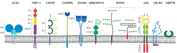 Рецепторы и корецепторы, задействованные в инфицировании клеток коронавирусом SARS-CoV2: ангиотензинпревращающий фермент 2 (ACE2), нейропилин-1 (NRP-1), CD147 или базигин, CD209L или L-SIGN, рецептор 1 асиалогликопротеинов (ASGR1), белок KREMEN1 (kringle containing transmembrane protein 1 – трансмембранный белок, содержащий крингл-домен), гепарансульфатные протеогликаны (HSPG) синдекан и глипикан, рецепторная тирозинкиназа AXL, скэвенджер-рецептор типа 1 липопротеинов высокой плотности (SR-B1), GRP78 (glucose-regulated protein 78 – регулируемый глюкозой белок 78). Показаны домены рецепторных белков – GD (globular domain – глобулярный домен), ND (neck domain – соединительный домен), MAM (meprin, A-5 protein, receptor protein-tyrosine phosphatase µ), иммуноглобулиновые домены (D1 и D2), CRD (carbohydrate recognition domain – узнающий углеводы домен), KD (kringle domain – крингл или крендель домен), WSC (cell wall integrity and stress response component – компонент целостности клеточной стенки и ответа на стресс), CUB (complement C1r/C1s, Uegf, Bmp1), Ig-like (иммуноглобулин-подобный домен), FNIII (fibronectin type III – домен фибронектина III типа), kinase (тирозинкиназа), гликозильные остатки на молекуле CD147 и гепарансульфаты синдеканов и глипиканов.