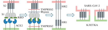 Праймирование S-белка коронавируса SARS-CoV-2 и слияние вирусной и клеточной мембран. НR1 и HR2 – гептапептидные повторы 1 и 2.