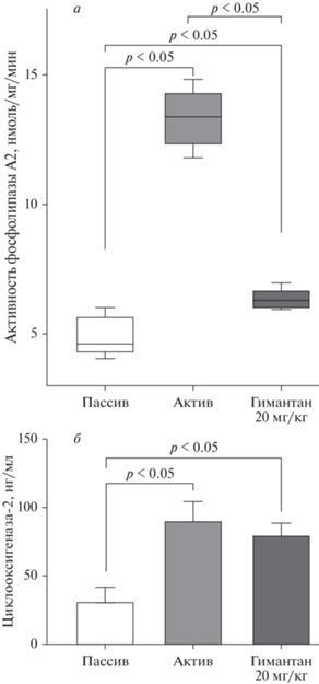 Влияние гимантана на активность фосфолипазы А2 (а) и уровень циклооксигеназы-2 (б) в перитонеальном экссудате мышей с уксусным перитонитом. а – Данные представлены в виде боксплотов (нормальность распределения в группах и/или равенство дисперсий отсутствовали); б – данные представлены в виде среднего значения и стандартного отклонения (нормальное распределение в группах, равенство дисперсий соблюдалось). Пассив – “Пассивная группа”, группа мышей, которым не вводили раствор уксусной кислоты, а вместо него вводили эквивалентный объем растворителя – физиологического раствора. Актив – “Активная группа”, группа мышей, которым внутрибрюшинно вводили 1% раствор уксусной кислоты. Гимантан 20 мг/кг – группа мышей с уксусным перитонитом, которым за 40 мин до его индукции внутрибрюшинно вводили гимантан в дозе 20 мг/кг. В каждой группе по 8 мышей.