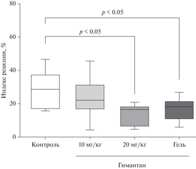 Влияние гимантана при однократном внутрибрюшинном введении и наружном нанесении гелевой лекарственной формы на заднюю конечность на вызванный конканавалином А отек стопы у мышей. Контроль – группа мышей с вызванным конканавалином А отеком стопы. В каждой группе 11–12 животных. Индекс реакции (%) рассчитывали по формуле, приведенной в разделе “Материалы и методы“. Данные представлены в виде боксплотов (нормальность распределения в группах и/или равенство дисперсий отсутствовали).