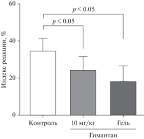 Влияние гимантана при внутрибрюшинном введении и наружном нанесении гелевой лекарственной формы на заднюю конечность в течение 10 дней на вызванный конканавалином А отек стопы у мышей. Контроль – группа мышей с вызванным конканавалином А отеком стопы. В каждой группе 11–12 животных. Индекс реакции (%) рассчитывали по формуле, приведенной в разделе “Материалы и методы”. Данные представлены в виде среднего значения и стандартного отклонения (нормальное распределение в группах, равенство дисперсий соблюдалось).