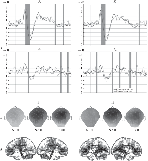 ПСС у здоровых испытуемых (GrandMean n = 20). А – ПСС в ответ на стандартный и девиантный тон в лобных и теменных отведениях, серым цветом выделены области, где отличия значимые (p < 0.05). Б – амплитудные топограммы на пиковых латентностях компонентов N100, N200 и Р300. В – визуализация функциональных связей через реконструированные предположительно активные тракты мозга в ответ на I – стандартный и II – девиантный тон.