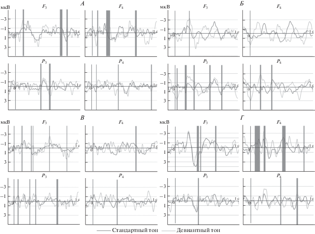 На рис. 1 показаны ПСС в лобных и теменных (F3, F4, P3, P4) отведениях. Серым цветом выделены временны́е интервалы, на которых отличия ПСС в ответ на стандартный и девиантный тон достигают статистической значимости (p < 0.05). Для левой лобной области Fs: 55–215, 575–580, 688–697 мс, правой лобной области Fd: 155–206, 674–678, 689–694 мс, левой теменной области Рs: 183–194, 647–661, 743–761 мс, правой теменной области Рd : 187–196, 408–411, 512–518, 652–673, 753–757 мс.