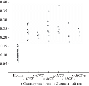 Средние значения функциональных связей, усредненные по всем возможным парам отведений. Представлены значения для каждого испытуемого и пациента в ответ на стандартный и девиантный тон. з-UWS – затяжное UWS, x-UWS – хроническое UWS, з-MCS – затяжное MCS, х-MCS – хроническое MCS, з-MCS-в – затяжное MCS c последующей положительной клинической динамикой, х-MCS-в – хроническое MCS с последующей положительной клинической динамикой.
