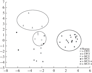 Данные дискриминантного анализа. Проекция пациентов на наилучшую разделяющую плоскость. Обозначения см. рис. 3.