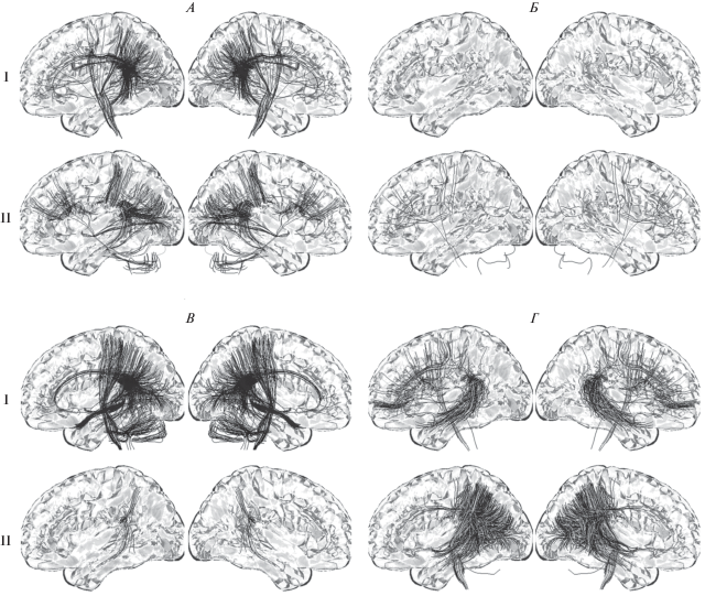 Пересчет функциональных связей на тракты мозга у пациентов с нарушением сознания. В ответ на I – стандартный и II – девиантный тоны у пациентов. А – с затяжным UWS, Б – хроническим UWS, В – затяжным MCS, Г – хроническим MCS.