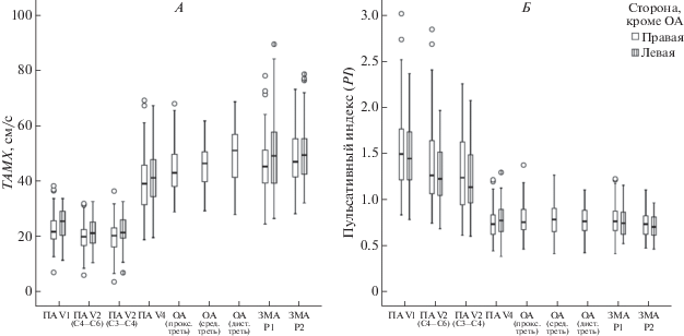 Усредненная по времени максимальная скорость кровотока (TAMX) и пульсативный индекс (PI) в артериях заднего бассейна. А – усредненная по времени максимальная скорость кровотока в разных артериях заднего бассейна, Б – пульсативный индекс в разных артериях заднего бассейна; графическое представление (боксплоты). ПА – позвоночная артерия, V2, V4 – сегменты ПА, С4−С6, С3−С4 – шейные позвонки (уровень оценки ПА), ОА – основная артерия, ЗМА – задняя мозговая артерия, Р1, Р2 – сегменты ЗМА.