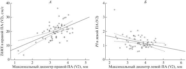 Зависимость TAMX в правой ПА (А) и PI в левой ПА (Б) от диаметров артерий. А – зависимость усредненной по времени максимальной скорости кровотока в правой ПА от ее диаметра, Б – зависимость пульсативного индекса в левой ПА от ее диаметра. Остальные обозначения см. рис. 1.
