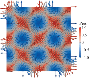 Следует подчеркнуть, что течение структурировалось на квадраты, внутри которых вращаются вихри с центрами, расположенными в узлах сетки $\partial D(t) = \pi \times {{\mathbb{Z}}_{2}}$ + 0.5 × (π, π), в которых скорость течения обращается в нуль. На границах квадратов, расположенных под углами ±45° и центрами на сетке, жидкость скользит по касательной. Аналогичное структурирование течения проводящей жидкости наблюдалось при описании точного трехмерного решения системы уравнений магнитной гидродинамики с условием скольжения на границе параллелепипеда [11].