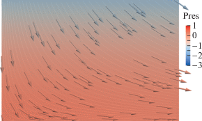 Ниже приведены результаты расчетов в моменты времени t = 0.2 (рис. 4). На рисунках цветом отображены значения поля давления p, стрелками показано направление поля скорости ${\mathbf{u}} = \nabla \Psi $, соответствующее потенциальному течению жидкости. В начальный момент времени и при t = 1 жидкость покоится.