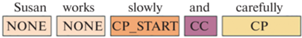 В последнее время наиболее перспективные подходы к CA состоят в использовании моделей, решающих задачи, сходные с извлечением информации (Information extraction, IE). Одна из разновидностей задачи, Open Information Extraction, заключается в извлечении троек вида “субъект, предикат, объект”. Например, в предложении “John managed to open the door” такой тройкой является (John, managed to open, the door). Модель OpenIE для входного предложения должна выдавать набор “масок”, где каждый токен будет помечен одним из 4 классов: “субъект”, “объект”, “отношение” или “фон”. Аналогично можно сформулировать и задачу CA: для входного предложения модель должна научиться находить набор масок, где каждый токен помечен одним из 6 классов: CP_START – токен, с которого начинается структура; CP – элементы, соединяемые союзом, CC – союз; SEP – разделители разных частей структуры, например, запятые, OTHERS – все, что не относится к категориям выше, но присутствует в структуре; NONE – не относящиеся к структуре слова. Так, пример, приведенный выше, будет размечен как на рис. 2.