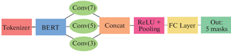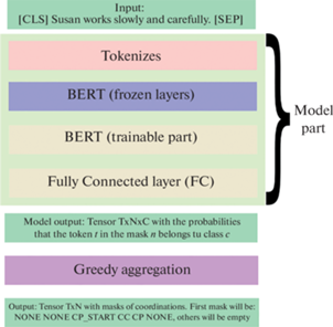 Далее идет несколько этапов, связанных с архитектурой модели. А именно – сначала предложение разделяется на токены, затем извлекаются эмбеддинги с помощью предобученной модели BERT (с несколькими последними “размороженными” слоями для возможности дообучить модель под задачу). Далее эмбеддинги подаются на вход полносвязному слою, на выходе которого получается тензор размера $(T,N,C)$, где $T$ – количество токенов во входном предложении (добавленные токены CLS и SEP не учитываются), $N$ – предварительно заданное количество извлекаемых масок ($N = 5$), $C$ – количество классов (C = 6). После применения к данному тензору преобразования softmax будет получен тензор такого же размера $(T,N,C)$, в котором в позиции $(t,n,c)$ будет записана величина, которую можно интерпретировать как вероятность ${{p}_{{tnc}}}$ того, что токен $t$ в маске $n$ относится к классу $c$. Именно по этому тензору оценок вероятностей вычисляется функция потерь.