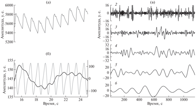 Фрагменты сигналов для одного из испытуемых: (а) – фрагмент оригинальной записи ФПГ с указательного пальца левой руки, (б) – модулирующий (сплошная жирная черная линия, ось слева) и несущий (сплошная тонкая серая линия, ось справа) компоненты сигнала кардиоритма, отфильтрованного в полосе частот 0.6–2 Гц из регистрируемого ФПГ-сигнала, (в) – декомпозиция методом Гильберта-Хуанга модулирующего компонента на эмпирические моды (представлены моды со 2 по 6, номера над кривыми).