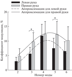 Несущая составляющая кардиоритма в сигнале ФПГ представляет собой немодулированный сигнал кардиоритма, а амплитуда этого сигнала определяет амплитуду кардиоритма (АК). Статистический анализ показал, что усредненные по группе испытуемых АК для левой и правой руки составляли 186.3 ± 69.2 и 180.4 ± 67.9 у.е. соответственно (данные представлены как среднее ± СКО) и достоверно не различались. Отношение усредненных по времени амплитуд мод модулирующей компоненты кардиоритма в сигнале ФПГ к АК определяет коэффициенты глубины модуляции (ГМ) для каждой моды. На рис. 2 представлены коэффициенты ГМ мод со 2 по 6 для левой и правой руки. Видно, что ГМ для левой руки ниже, чем для правой и достоверно различаются для 3 и 5 моды. Распределение ГМ по номерам мод хорошо аппроксимируется функциями Гаусса. Аппроксимация показывает, что ширина колокола для левой руки меньше, чем для правой.