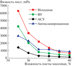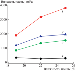 Зависимость вязкости пасты от исходной влажности образцов дерново-подзолистой почвы, имеющих разную пробоподготовку. Содержание воды в пастах пасты 37%. Почвы: 1 – исходная, 2 – автоклавированная, 3 – ВУ, 4 – АСУ.
