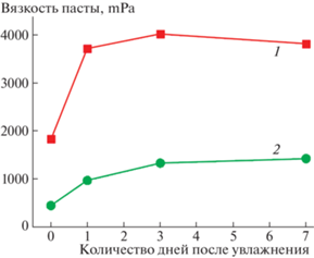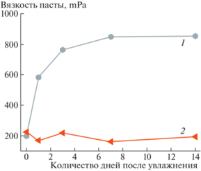 Динамика изменения вязкости пасты в зависимости от времени, прошедшего после увлажнения ВС (1) и АС (2) образцов дерново-подзолистой почвы. Влажность почвы 19%. Содержание воды в пастах 37%.