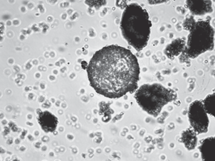 Фото препарата из образца № 2 копролита P. brevirostris. В центре яйцо Toxocara sp. (увел. ×400).