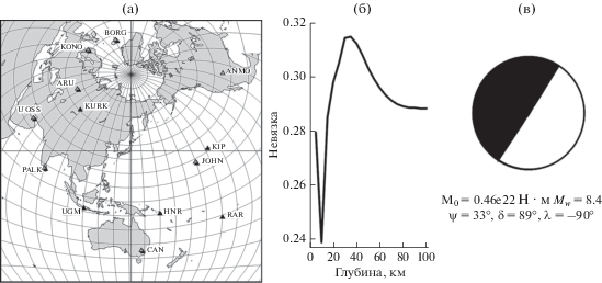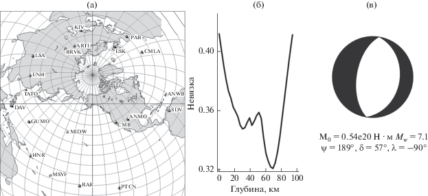 Для оценки фокального механизма и глубины источника мы использовали спектры 18 основных моды Лява и 19 мод Рэлея в полосе периодов от 70 до 250 с. Карта распределения использованных станций сейсмических сетей IRIS и GEOSCOPE приведена на рис. 5а. Функция невязки для глубины источника (оценка глубины равна 65 км) и его фокальный механизм приведены на рис. 5б и 5в. Полученная величина сейсмического момента 0.54 × 1020 Н м соответствует магнитуде Mw = 7.1. Для выбора наилучшего из эквивалентных решений использовали знаки первых вступлений Р-волн. Полученное решение существенно не отличается от решения из Глобального СМТ-каталога3.