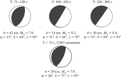Решение, полученное нами, не совпадает с решением из Глобального СМТ каталога33. Это связано с выбранным диапазоном периодов. Дело в том, что при перемещении этого диапазона из области периодов, недостаточно длинных для использования приближения точечного мгновенного источника, в область более длинных периодов оценки параметров очага существенно изменяются. Когда же периоды становятся достаточно длинными и указанное приближение – адекватным, оценки параметров перестают изменяться с дальнейшим ростом периодов. Поэтому нами был выбран диапазон периодов от 100 до 200 с. Если же использовать диапазон более коротких периодов (от 75 до 120 с), то решение совпадает с решением из Глобального СМТ-каталога, как видно из рис. 2.