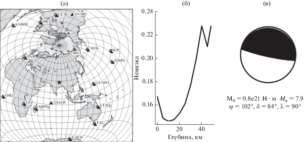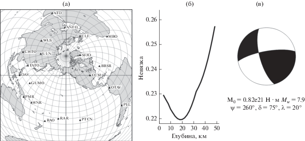 Оптимальным из четырех эквивалентных решений, полученных из анализа амплитудных спектров поверхностных волн, считаем то, что наилучшим образом согласуется с зарегистрированными знаками первых вступлений. Функция невязки для глубины источника (оценка глубины равна 20 км) и его фокальный механизм (сдвиг с незначительным взбросом) приведены на рис. 4б и 4в. Полученная величина сейсмического момента 0.82 × 1021 Н м соответствует магнитуде Mw = 7.9. Данное решение существенно не отличается от решения из Глобального СМТ-каталога3.
