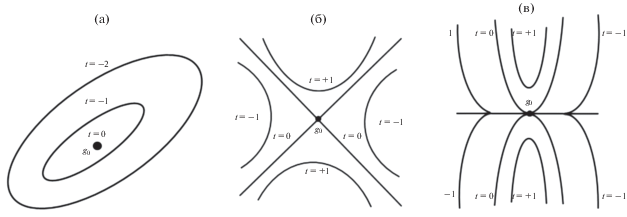 Изохроны функции ${{t}_{а}}({\mathbf{g}})$ вблизи критической точки ${{g}_{0}}{\text{:}}$ (a), (б) – случаи, в которых ${{g}_{0}}$ является регулярной стационарной точкой; (в) – случай условной регулярной стационарной точки ${{g}_{0}}$ на линии $l,$ где ${{t}_{а}}({\mathbf{g}})$ теряет гладкость.