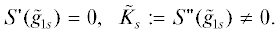 Пусть ${{t}_{r}}({\mathbf{g}})$ теряет гладкость на линии $l:{{g}_{2}} = \psi ({{g}_{1}}).$ Будем считать, что ${{t}_{r}}({\mathbf{g}})$ представлена двумя гладкими поверхностями $t_{r}^{ \pm }({\mathbf{g}})$ с общим гладким краем, расположенным над гладкой кривой $l.$ Рассмотрим сужение ${{t}_{a}}({\mathbf{g}})$ на линию $l:S({{g}_{1}}) = {{t}_{a}}({{g}_{1}},\psi ({{g}_{1}})).$ Точку ${{{\mathbf{\tilde {g}}}}_{s}} = ({{\tilde {g}}_{{1s}}},\psi ({{\tilde {g}}_{{1s}}}))$ назовем условной стационарной точкой на ${{t}_{r}}({\mathbf{g}}),$ если $S{\kern 1pt} '({{\tilde {g}}_{{1s}}}) = 0.$ Условная стационарная точка считается регулярной, если: