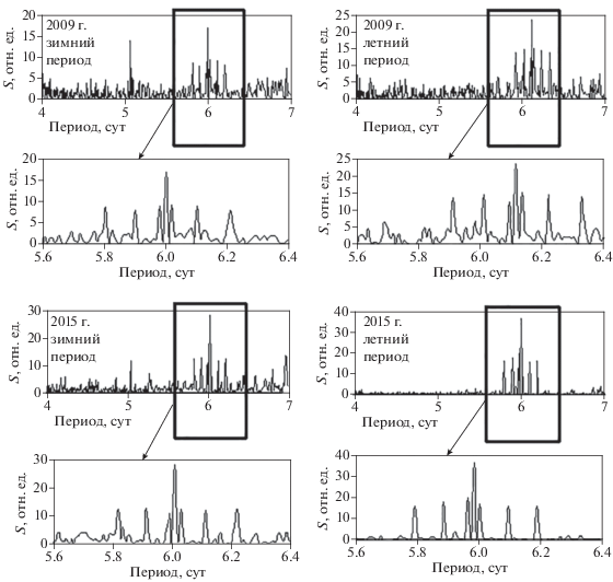 Остановимся подробнее на анализе спектров геомагнитных вариаций в диапазоне, близком к периоду 5-суточной планетарной волны. На рис. 1 приведены спектры за периоды: с декабря 2008 г. по февраль 2009 г. (зимний период, низкая солнечная активность), с июня 2009 г. по август 2009 г. (летний период, низкая солнечная активность), с декабря 2014 г. по февраль 2015 г. (зимний период, высокая солнечная активность), с июня 2015 г. по август 2015 г. (летний период, высокая солнечная активность). Анализ спектров, приведенных на рис. 1, показывает, что во всех спектрах присутствует спектральная составляющая, которую можно отождествить с одной из гармоник 27-суточной геомагнитной вариации (приблизительно 6 сут). Напомним, что 27-суточные вариации связывают с периодом обращения видимой поверхности Солнца относительно земного наблюдателя (периодичность обусловлена неравномерным распределением активных областей на Солнце). Кроме того, в спектрах можно идентифицировать целый ряд спектральных гармоник, обусловленных так называемым модуляционным воздействием длиннопериодных вариаций на более короткопериодные [Рябова, Спивак, 2019], т.е. в спектрах присутствуют гармоники с частотами ${{\omega }_{0}}$ (основная гармоника), ${{\omega }_{0}} + \Omega $ (верхняя боковая гармоника) и ${{\omega }_{0}} - \Omega $ (нижняя боковая гармоника), где ω0 ‒ круговая частота немодулированного несущего колебания, Ω ‒ частота модуляции амплитуды несущего колебания [Андреев, 1982]. Например, в спектре за зимний период 2009 г. пик с периодом 6 сут ‒ гармоника 27-суточной периодичности; пики с периодами ~5.98 и ~6.02 сут ‒ модуляционное воздействие на эту гармонику 11-летним циклом; пики с периодами ~5.9 и ~6.1 сут ‒ модуляционное воздействие на эту гармонику годовой вариации; пики с периодами 5.81 и 6.21 сут ‒ модуляционное воздействие на эту гармонику полугодовой вариации. Как видно из рис. 1, такие же пики хорошо идентифицируются в спектре и в другие временные промежутки. Однако в целом они лучше проявляются в период сильной солнечной активности.