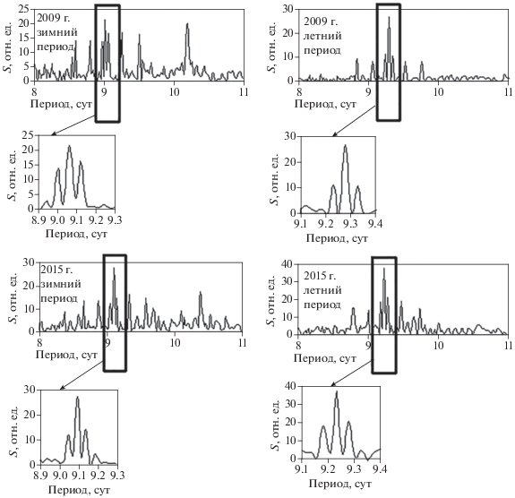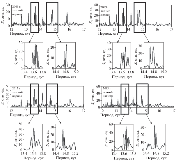 Здесь следует отметить, что в спектрах удается идентифицировать несколько гармоник. Наличие в спектрах пиков с периодами ~13.66 и ~14.76 сут и в зимний, и летний период в периоды высокой и низкой солнечной активности можно объяснить проявлением в спектре воздействия лунно-солнечного прилива [Адушкин и др., 2017; Шереметьева, 2011], поскольку периоды этих гармоник близки к периодам приливных волн Мf и Msf [Riabova, 2018]. Причем в период низкой солнечной активности проявление этих гармоник значительнее.