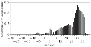 Кросс-коррелограмма между вариациями геомагнитного поля и атмосферного давления (декабрь 2008 г.‒ февраль 2009 г.).