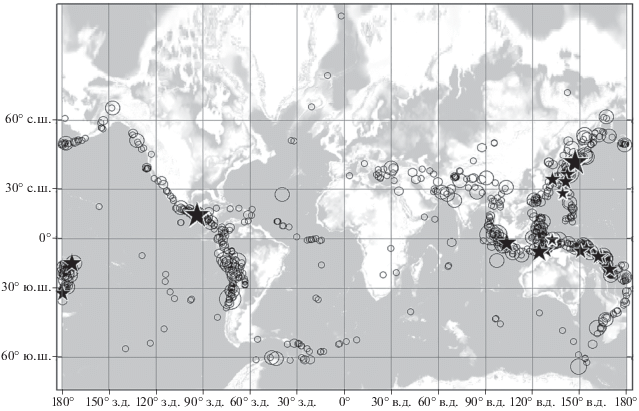 Рассмотрим пространственное распределение выявленных ВМБЗ. На рис. 1 показана карта эпицентров 935 землетрясений с Mw ≥ 6.5, произошедших на Земле в интервале 1994–2017 гг. (кружки). Звездочками отмечены 17 ВМБЗ из табл. 2. Здесь видны некоторые особенности: 5 событий произошли в районе Японии и 9 – на юго-западе Тихого океана. В то же время ВМБЗ отсутствуют в континентальной части Азии, Северной и Южной Америке. Проведем небольшой статистический анализ. Выделим на карте рис. 1 пять зон с координатами: зона 1 [60 с.ш.–20 с.ш.; 100 в.д.–200 в.д. – вблизи Японии;]; зона 2 [20 с.ш.–20 ю.ш.; 100 в.д.–200 в.д – Индонезия, Филиппины]; зона 3 [0–40 ю.ш.; 150–200 з.д. – Тонга]; зона 4 [20 с.ш.–40 ю.ш.; 50 з.д.–100 з.д. – Ю. Америка]; зона 5 [60 с.ш.–20 с.ш.; 100 з.д.–200 з.д. – С. Америка]. Обозначим число произошедших в мире землетрясений как N; их число в выделенных 5 зонах: N1, N2, N3, N4, N5 и число ВМБЗ в выделенных пяти зонах: n1, n2, n3, n4, n5. В зоне 1 произошли N1 = 134 землетрясения при числе ВМБЗ n1 = 5; в зоне 2: N = 251, n2 = 9; в зоне 3: N3 = 65, n3 = 3; в зоне 4: N4 = 129, n4 = 1; в зоне 5: N5 = 47, n5 = 0.