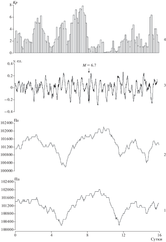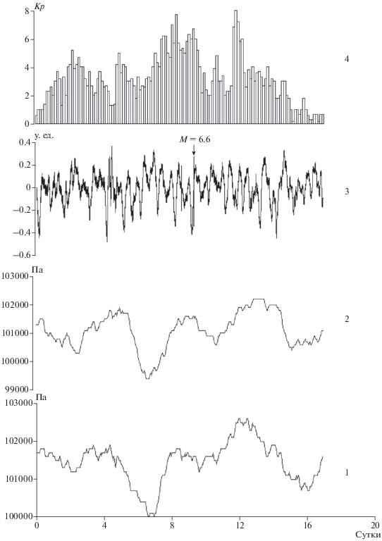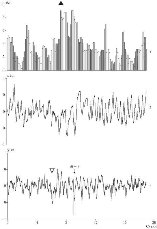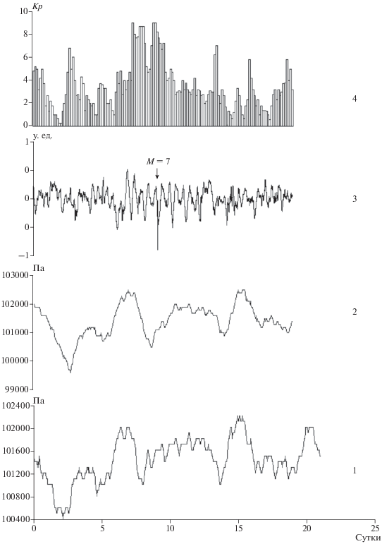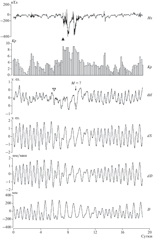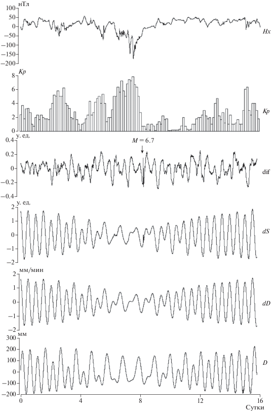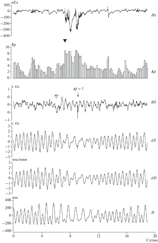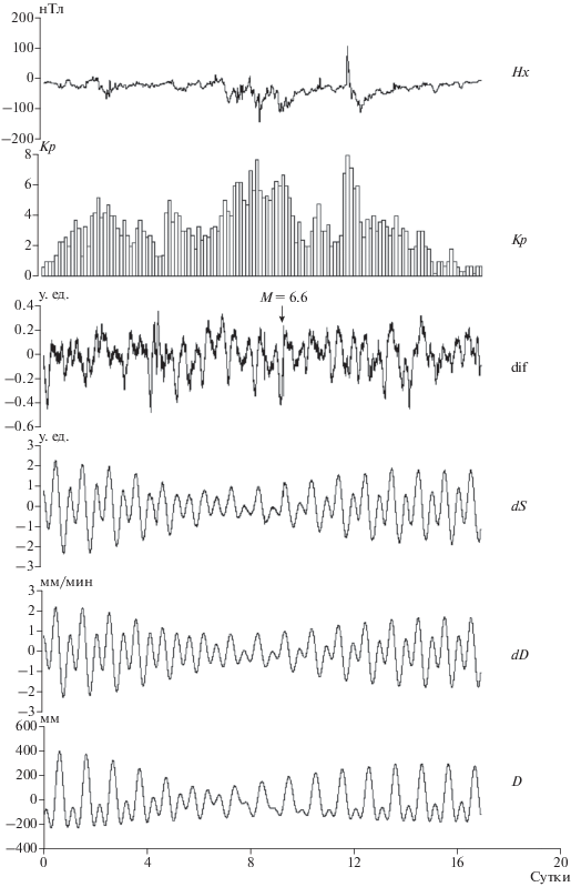 На рис. 3 представлены результаты сопоставления теоретического прилива (далее – прилива), записи вертикального сейсмического канала LHZ и вариаций геомагнитного поля с 22.10.2003 г. по 11.11.2003 г. График 1 демонстрирует вертикальные перемещения поверхности Земли приливного происхождения D; график 2 – производную по времени, т.е. скорость изменения прилива dD. График 3 соответствует записи вертикального сейсмического канала dS; при этом значения вариаций уменьшены в 103 раз, чтобы представить их в едином масштабе с амплитудой минутных теоретических значений скорости изменения прилива на графике 2. В графиках 1, 2, 3 хорошо выражены 12-часовые колебания. Коэффициент корреляции значений сейсмического канала (график 3) и скорости теоретического прилива (график 2) достигает 0.99. Это позволяет вычислять разность колебаний, регистрируемых сейсмическим каналом, по сравнению с приливом dif = dS – dD (график 4). Стрелкой обозначено землетрясение 31.10.2003 г. Оно случилось при затухании бури, максимальные значения при которой отмечены пиками Kp-индексов 29, 30 и 31 октября (7–9 сутки на графике 5). График Hx соответствует изменениям напряженности геомагнитного поля на обсерватории Какиока [36.23 с.ш.–140.18 в.д.], расположенной в 150 км от сейсмической станции MAJO. Представлена горизонтальная компонента, отчетливо демонстрирующая динамику бури. Наиболее сильное отклонение от нормального фона (300 нТл) опережало землетрясение в данном случае на 4 ч.