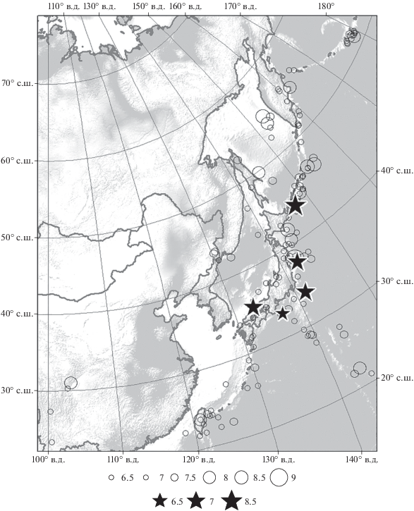 Магнитные бури неоднократно исследовались в качестве триггеров, влияющих на сейсмичность [Барсуков, 1991; Соболев и др., 2001; Закржевская, Соболев, 2004; Тарасов, 2017; 2019; Rabeh et al., 2010; Urata et al., 2018]. Это связано не только с научным интересом к электромагнитно-механическим преобразованиям в Земле. Вызванные вспышками на Солнце бури надежно документируются, как и землетрясения, что позволяет сопоставлять данные геофизические процессы на количественном уровне. В ряде работ методом накопления эпох было выявлено статистически значимое изменение количества землетрясений умеренной энергии E > 107 Дж при сильных бурях с уровнем планетарных Kp-индексов >5. Однако отмечались противоречивые явления. В работах [Соболев и др., 2001; Закржевская, Соболев, 2004] было указано, что в одних областях сейсмоактивного района проявляется тенденция увеличения сейсмичности при бурях, а в других – сейсмичность убывает. Кроме того, степень проявления триггерного эффекта меняется для одних и тех же областей во времени. В отличие от предыдущих исследований в настоящей работе исследуются не обобщенные связи между данными явлениями, как в методе накопления эпох, а проводится прямое попарное сопоставление самых мощных магнитных бурь и землетрясений высокой энергии.