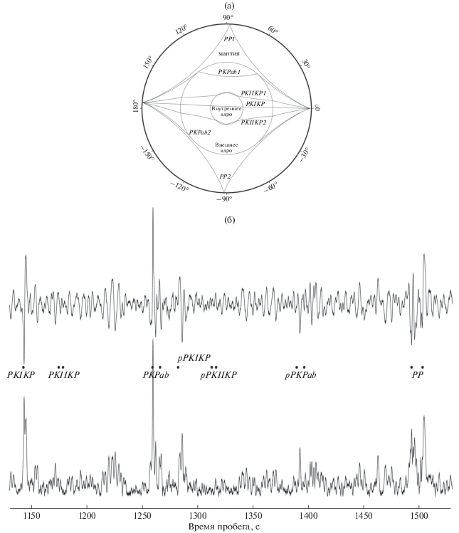 (а) – Геометрия лучей при наблюдениях на расстояниях вблизи антипода. Источник на глубине 100 км, станция на расстоянии 176°. Трасса PKPc-dif близка к PKIIKP1, однако распространяется вдоль границы внутреннего ядра; (б) – cейсмограмма (верхняя трасса) и ее огибающая Гильберта (нижняя трасса) землетрясения на Филиппинах 04.11.2018 г., зарегистрированного станцией NPGB в Бразилии. Точки – метки вступлений указанных сейсмических фаз, включая двойные вступления фаз PKIIKP, PKPab, pPKIIKP, pPKPab и РР, распространяющихся по длинному и короткому пути.