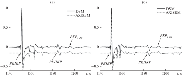 Сравнение результатов расчета сейсмограмм методами DSM (сплошная линия) и AXISEM (пунктирная линия) для источника на глубине 500 км и расстоянии Δ = 179.6°. Показаны фрагменты сейсмограмм длительностью 110 с. Сейсмограммы нормированы на максимальную амплитуду волны PKIKP. Пунктирная сейсмограмма смещена относительно нулевой линии на –0.15: (a) – модель IASP91; (б) – модель PREM.